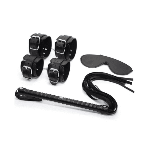Incluye 4 piezas: esposas, tobilleras, látigo y antifaz.